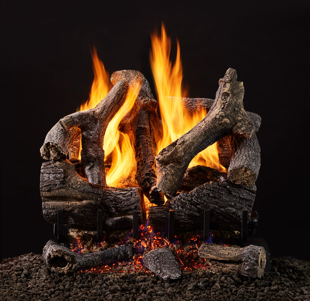 Conveniently update your wood-burning fireplace with the Grand Oak vented gas log set. Replace the hassle of an open wood fire for hand-painted oak logs and a tiered burner system (not included) that displays large flames and glowing embers on multiple levels.
