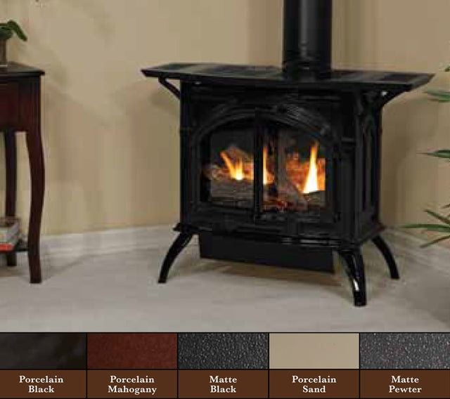 Our porcelain stoves start with a hand-applied pigment and glass mixture thatÕs oven fired to 1,500 degrees Fahrenheit to produce a rich durable finish that both softens and highlights edges. Porcelain finishes capture and reflect room light for exceptional visual interest. The porcelain mahogany finish features light and dark accents, for added visual interest.