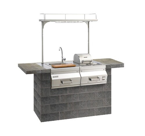 Features top storage shelf with rail, faucet with sink and drain, removable bamboo cutting board, storage drawer, wine glass holder, halogen lights, covered heavy-duty blender, insulated ice drawer, and 2 condiment holders.