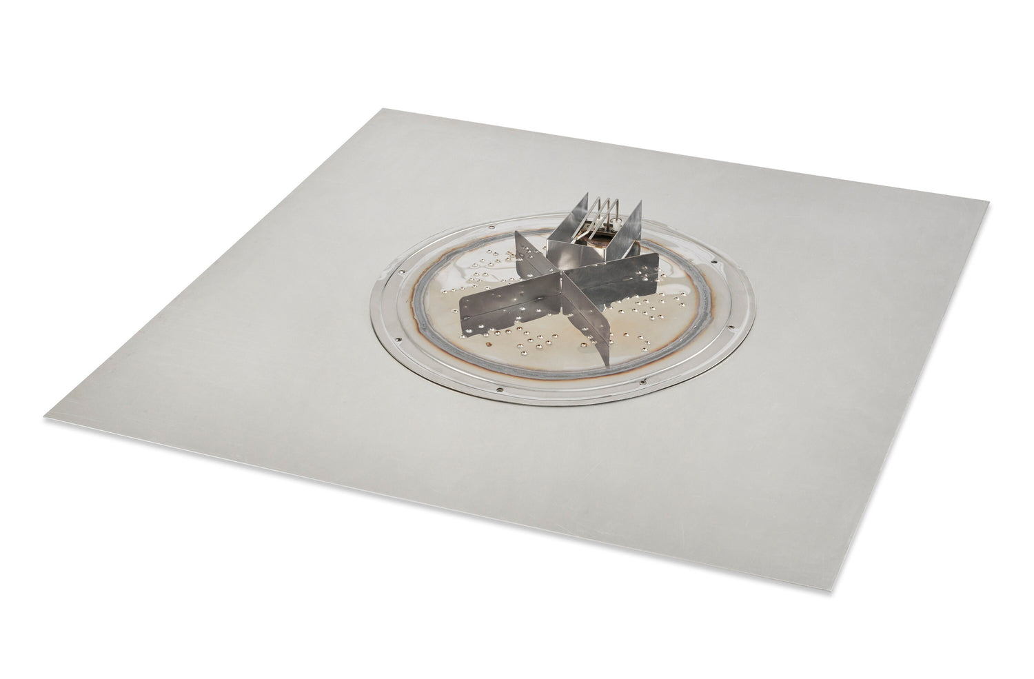 Square Stainless Steel Crystal Fire Plus Burner Insert and Plate KitsÊcan be used for custom-built fire pits or your own outdoor fire feature to complement your landscapingÊproject. A no-flange edge and undermount installationÊare concealed by fire media to highlight the gorgeous dancing flames. All burners have a higher BTU capacity and upgraded burner construction for a brighter, taller, fuller, more yellow flame. With just the push of a button, a beautiful clean-burning fire appears atop a bed of tempered fire glass gems.