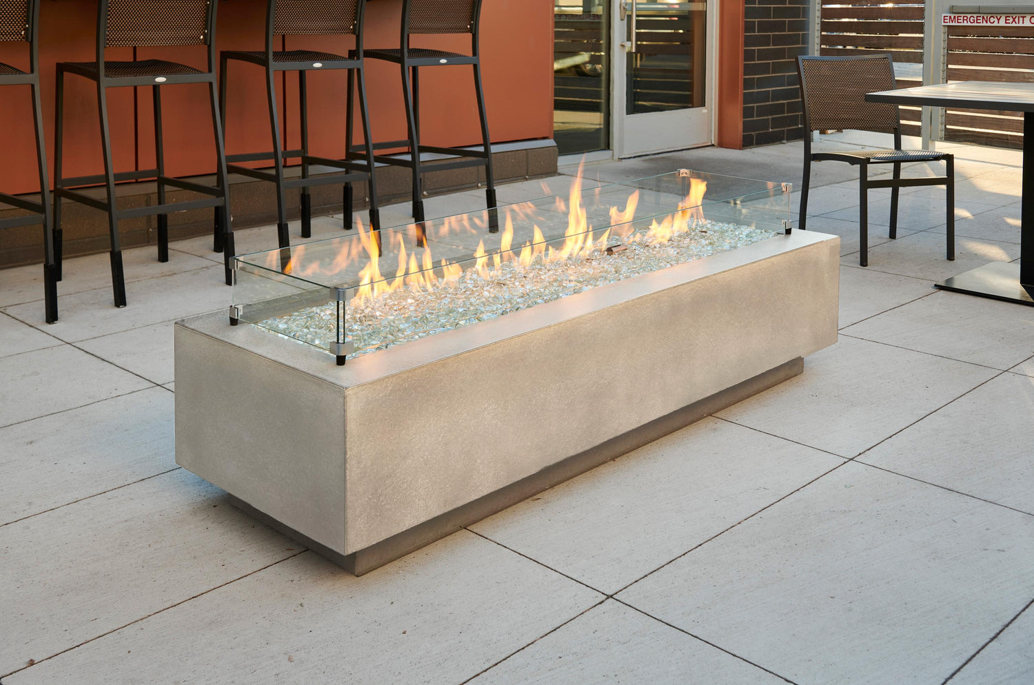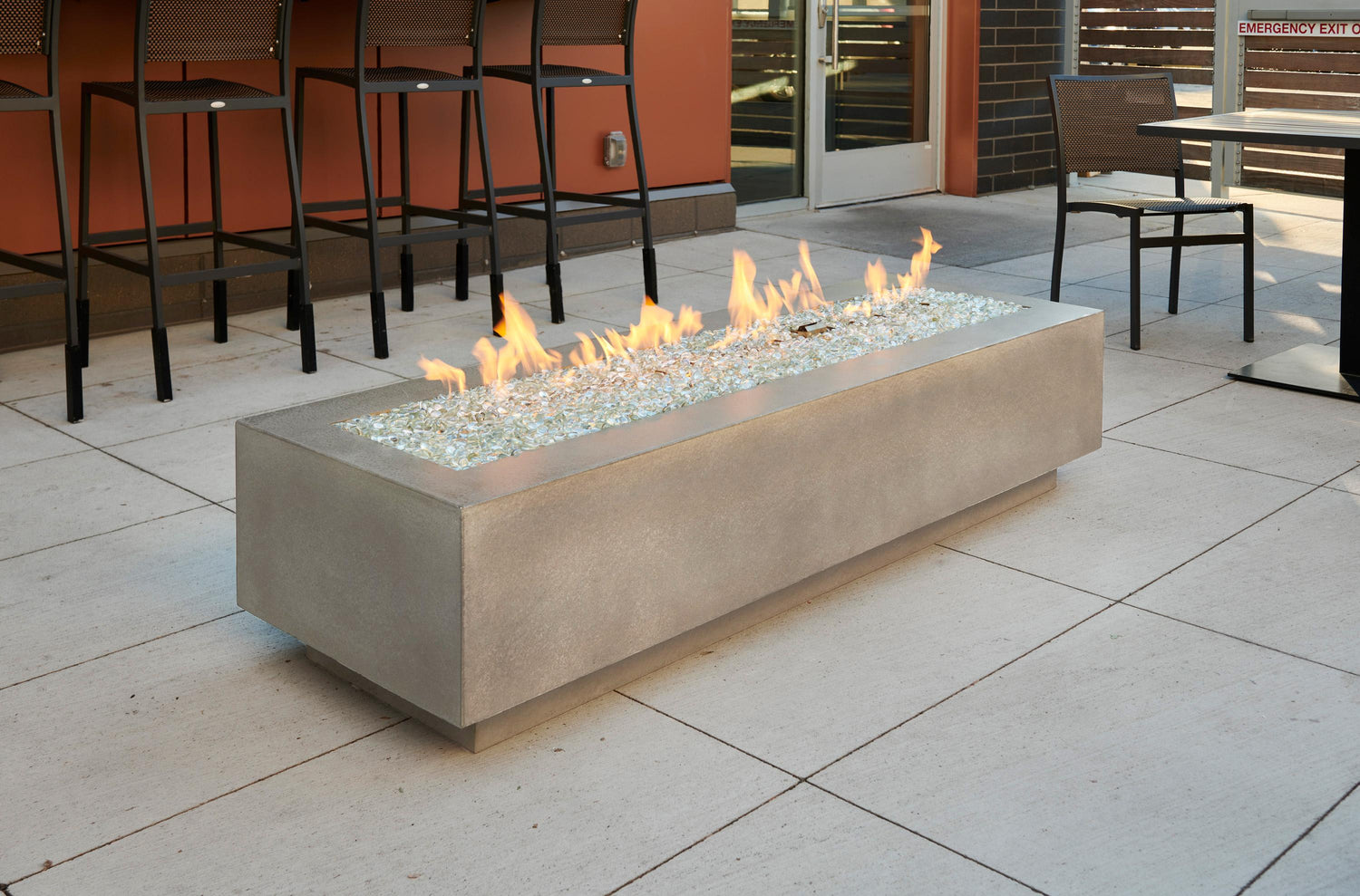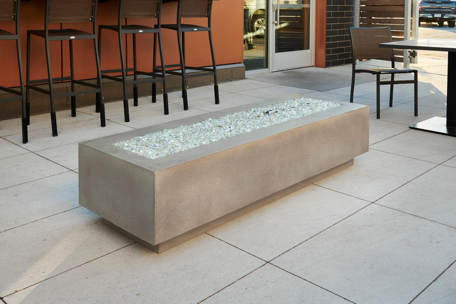 The Cove 72" Linear gas fire pit table is the perfect addition to any contemporary outdoor space. Choose between popular Natural Grey, Midnight Mist, or White Supercast concrete. The natural appearance of the concrete lets the focus be on the stunning Crystal Fire Plus Burner. The organic, nature of the concrete is unique to each fire pit. Color variations are casual pitting are common attributes to the fire pit.