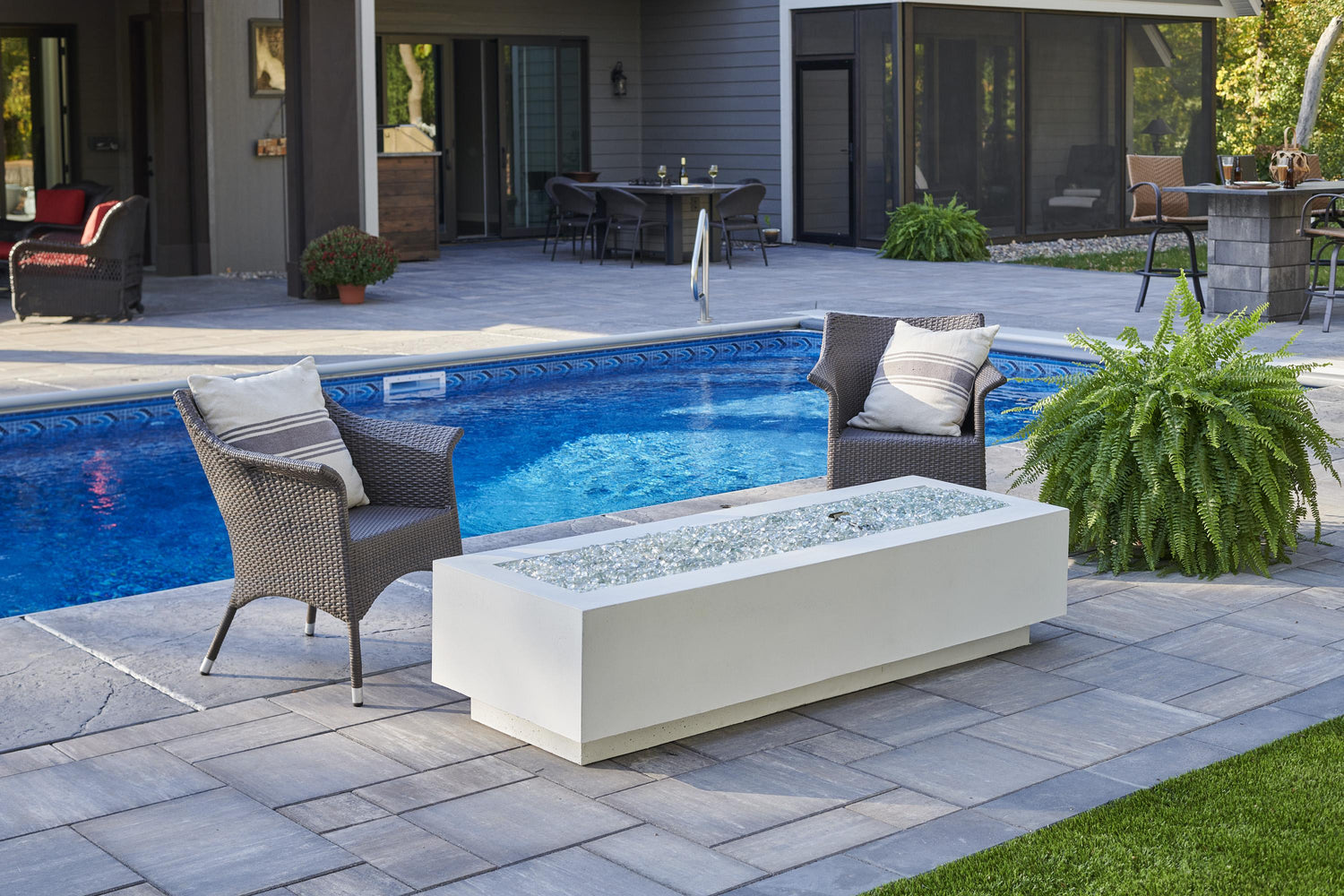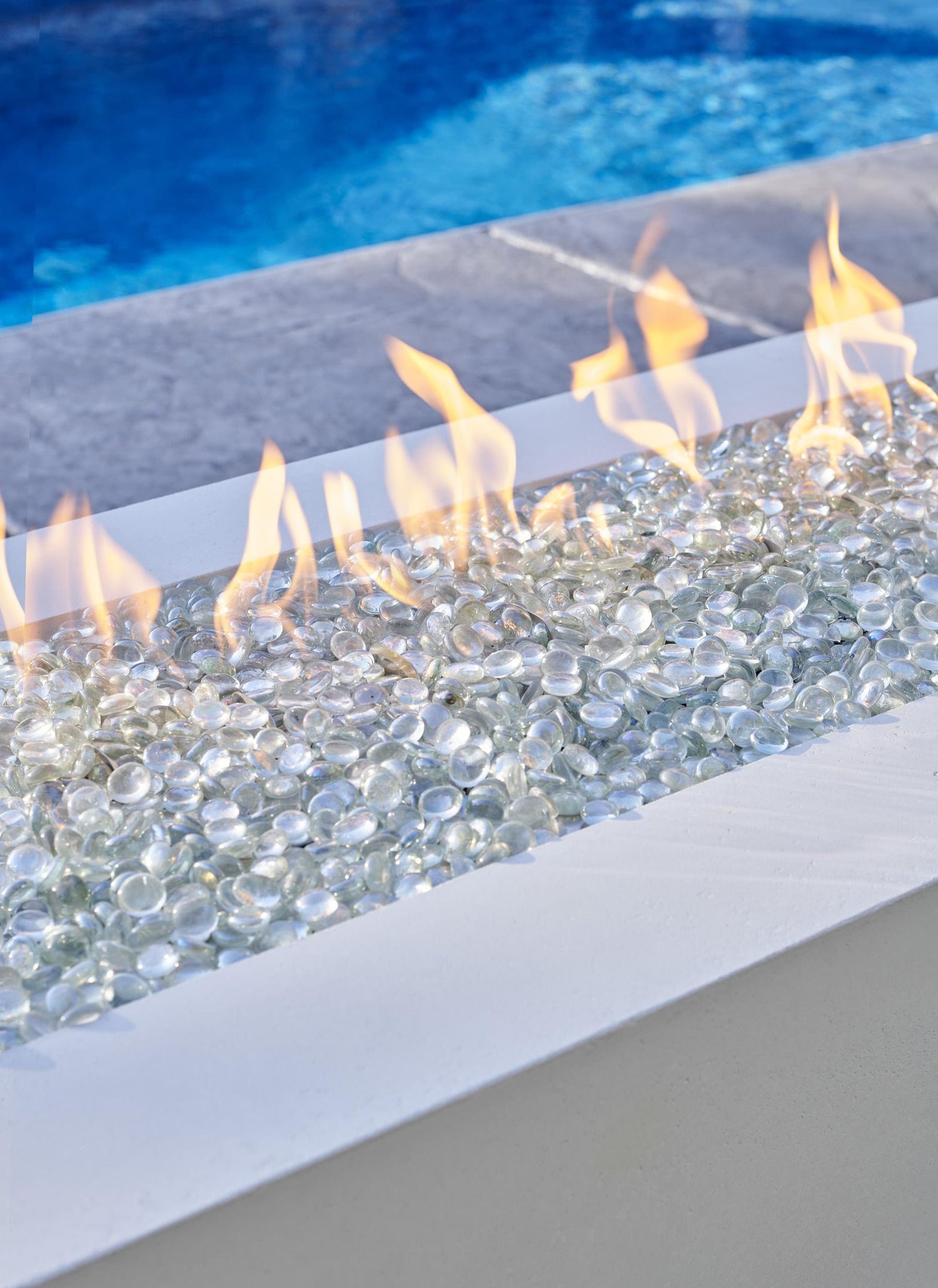 The Cove 72" Linear Gas Fire Pit Table is an ideal choice for those looking to add a touch of contemporary elegance to their outdoor space. The natural look of the Supercastâ„¢ concrete complements the stunning Crystal Fire ® Plus Burner, creating a perfect harmony.