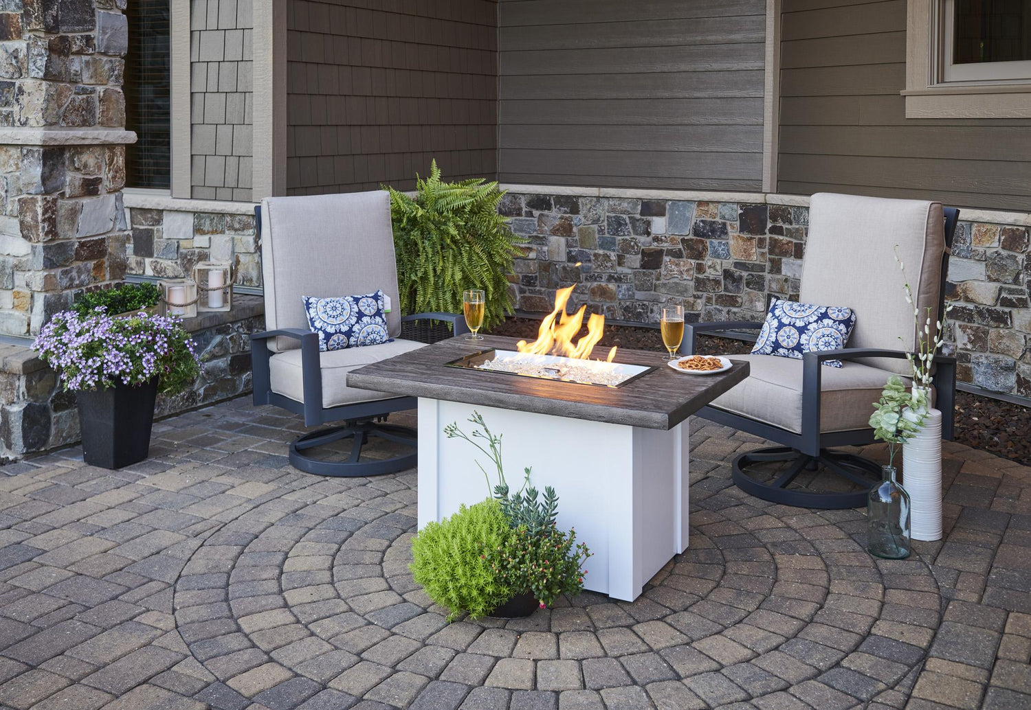The Driftwood Havenwood Gas Fire Pit Table offers a contemporary style that's perfect for entertaining. The unique Driftwood Everblend textured top pairs with a White powder-coated metal base. The 12" x 24" Crystal Fire Plus burner offers a warm, inviting glow. Every handcrafted Everblend top is one-of-a-kind - variations in color, texture, and pattern will occur.