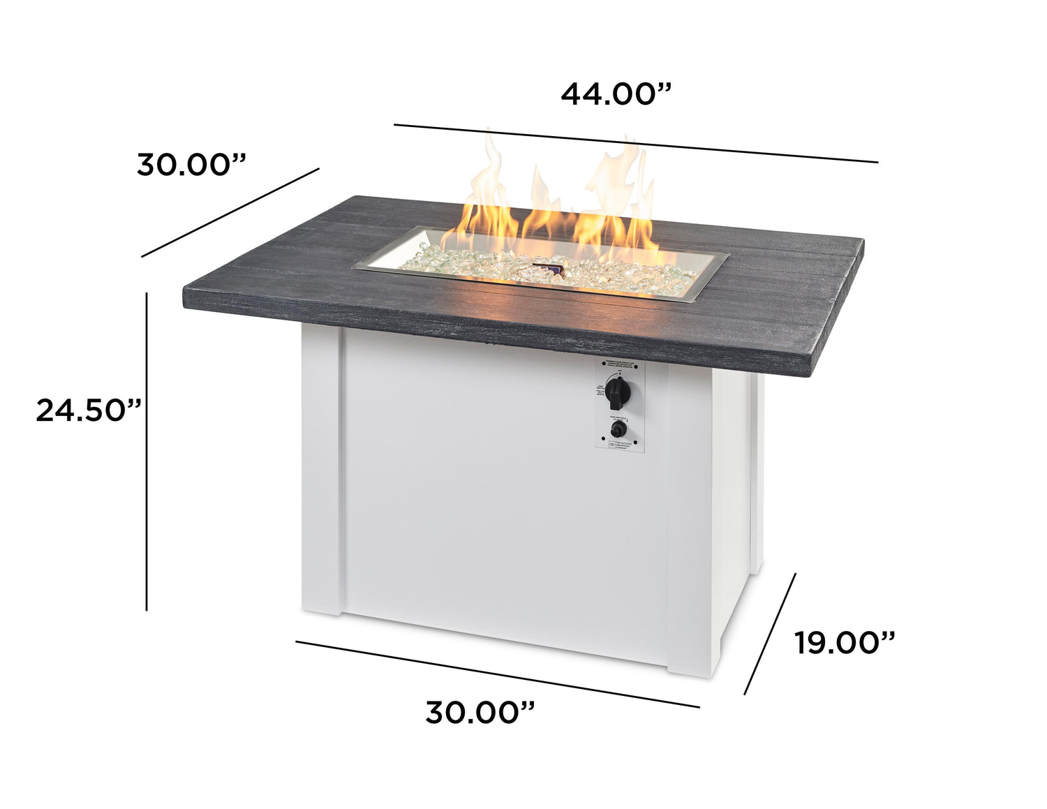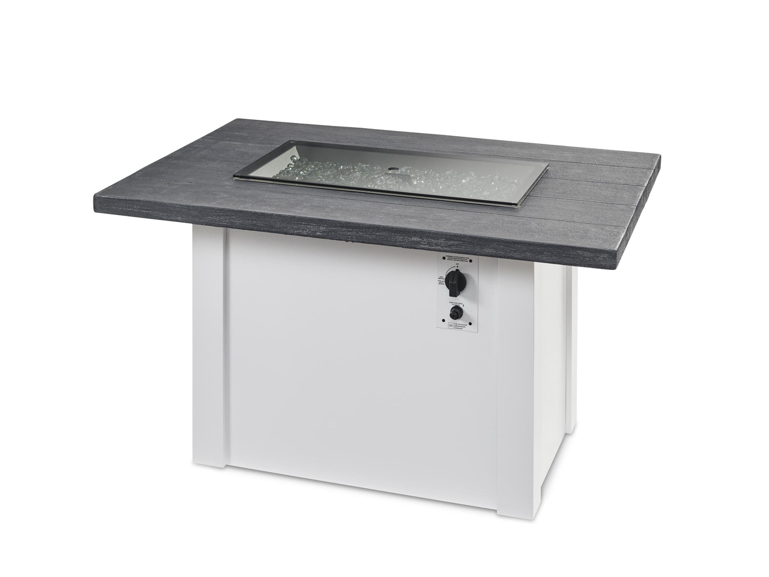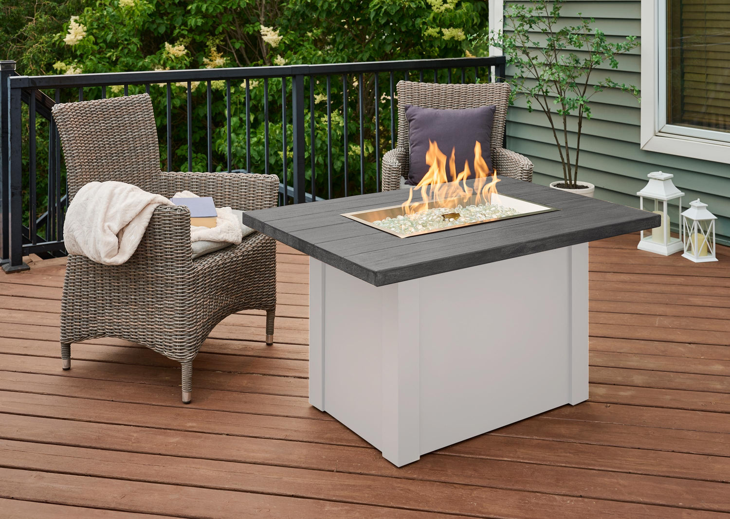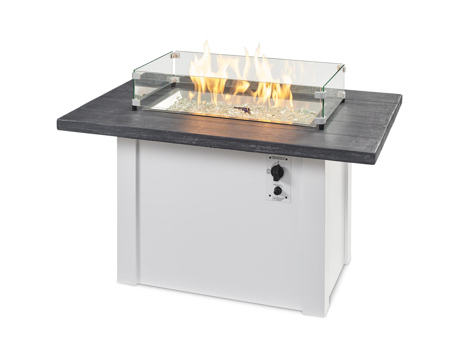 The Driftwood Havenwood Gas Fire Pit Table offers a contemporary style that's perfect for entertaining. The unique Driftwood Everblend textured top pairs with a white powder-coated metal base. The 12" x 24" Crystal Fire ® Plus burner offers a warm, inviting glow. Every handcrafted Everblend top is one-of-a-kind – variations in color, texture, and pattern will occur.