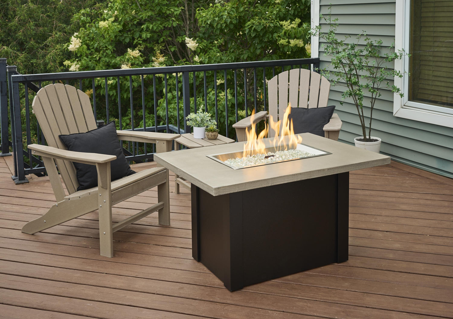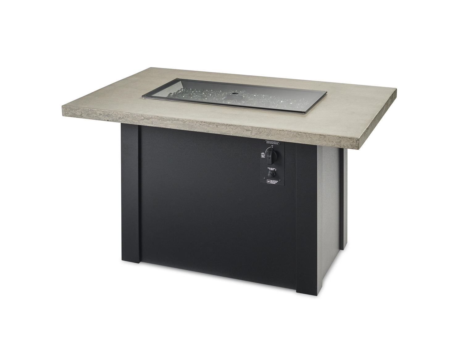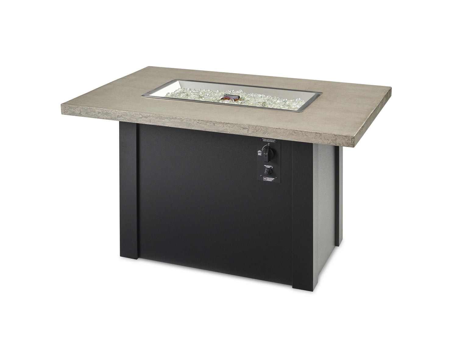 The Driftwood Havenwood Gas Fire Pit Table offers a contemporary style that's perfect for entertaining. The unique Driftwood Everblend textured top pairs with a black powder-coated metal base. The 12" x 24" Crystal Fire ® Plus burner offers a warm, inviting glow. Every handcrafted Everblend top is one-of-a-kind – variations in color, texture, and pattern will occur.