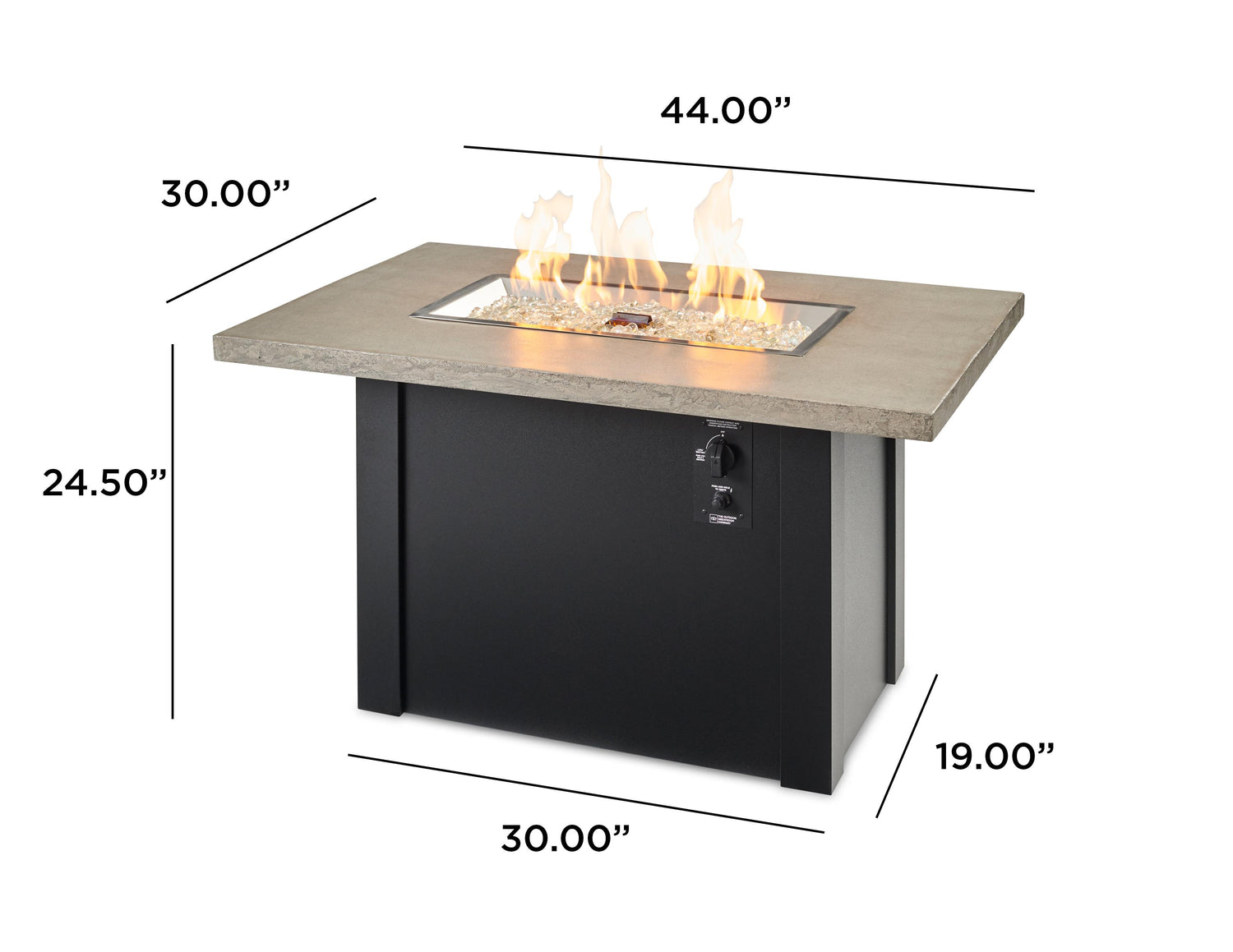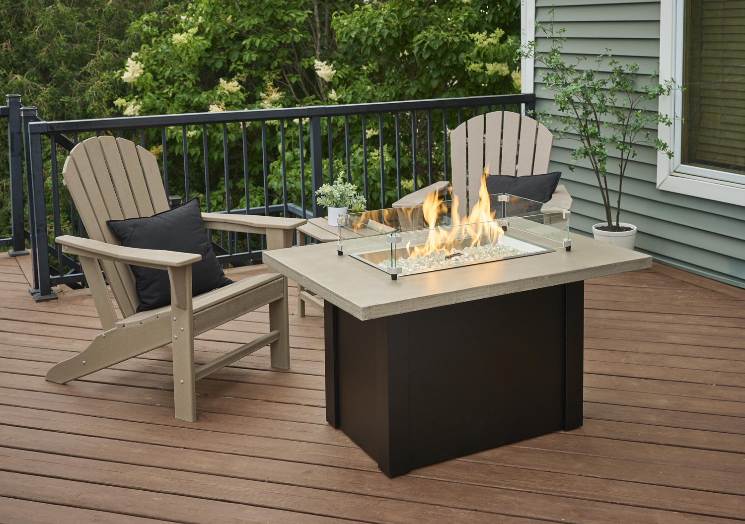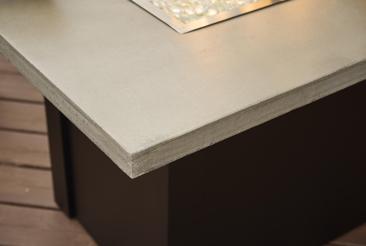 The Driftwood Havenwood Gas Fire Pit Table offers a contemporary style that's perfect for entertaining. The unique Driftwood Everblend textured top pairs with a black powder-coated metal base. The 12" x 24" Crystal Fire ® Plus burner offers a warm, inviting glow. Every handcrafted Everblend top is one-of-a-kind – variations in color, texture, and pattern will occur.