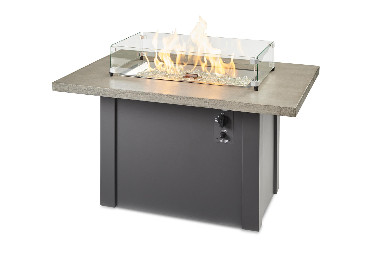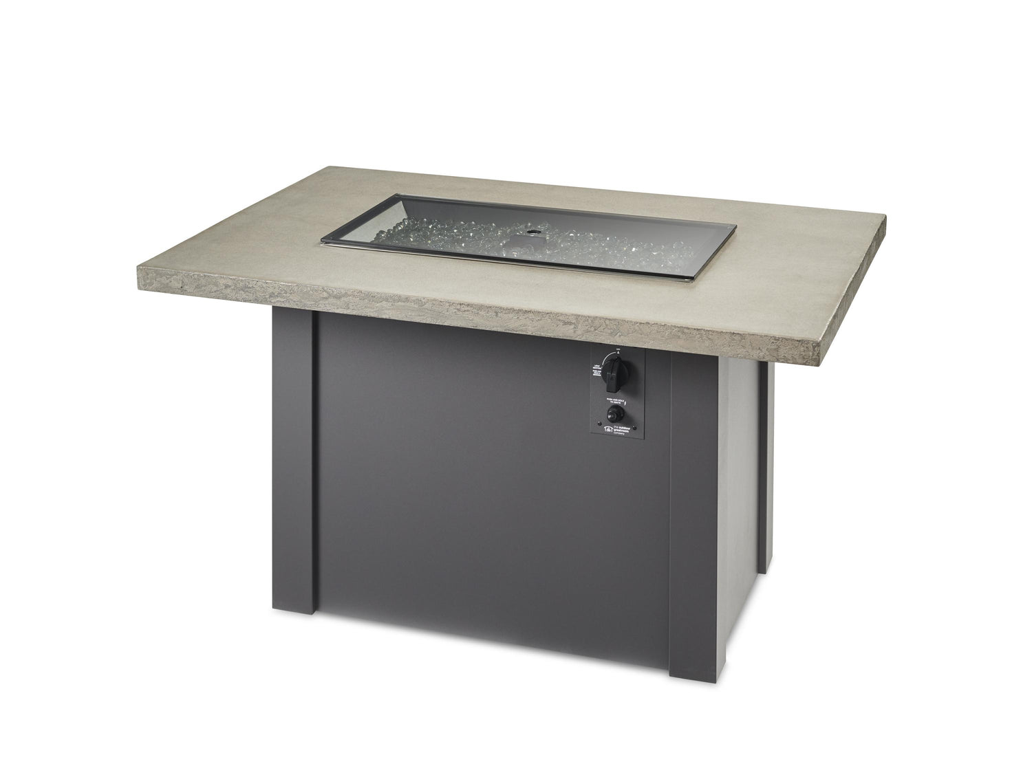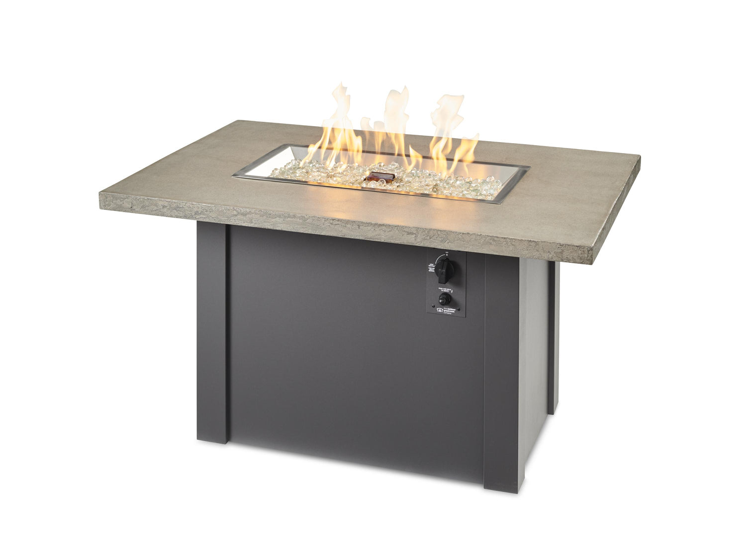 The Driftwood Havenwood Gas Fire Pit Table offers a contemporary style that's perfect for entertaining. The unique Driftwood Everblend textured top pairs with a grey powder-coated metal base. The 12" x 24" Crystal Fire ® Plus burner offers a warm, inviting glow. Every handcrafted Everblend top is one-of-a-kind – variations in color, texture, and pattern will occur.