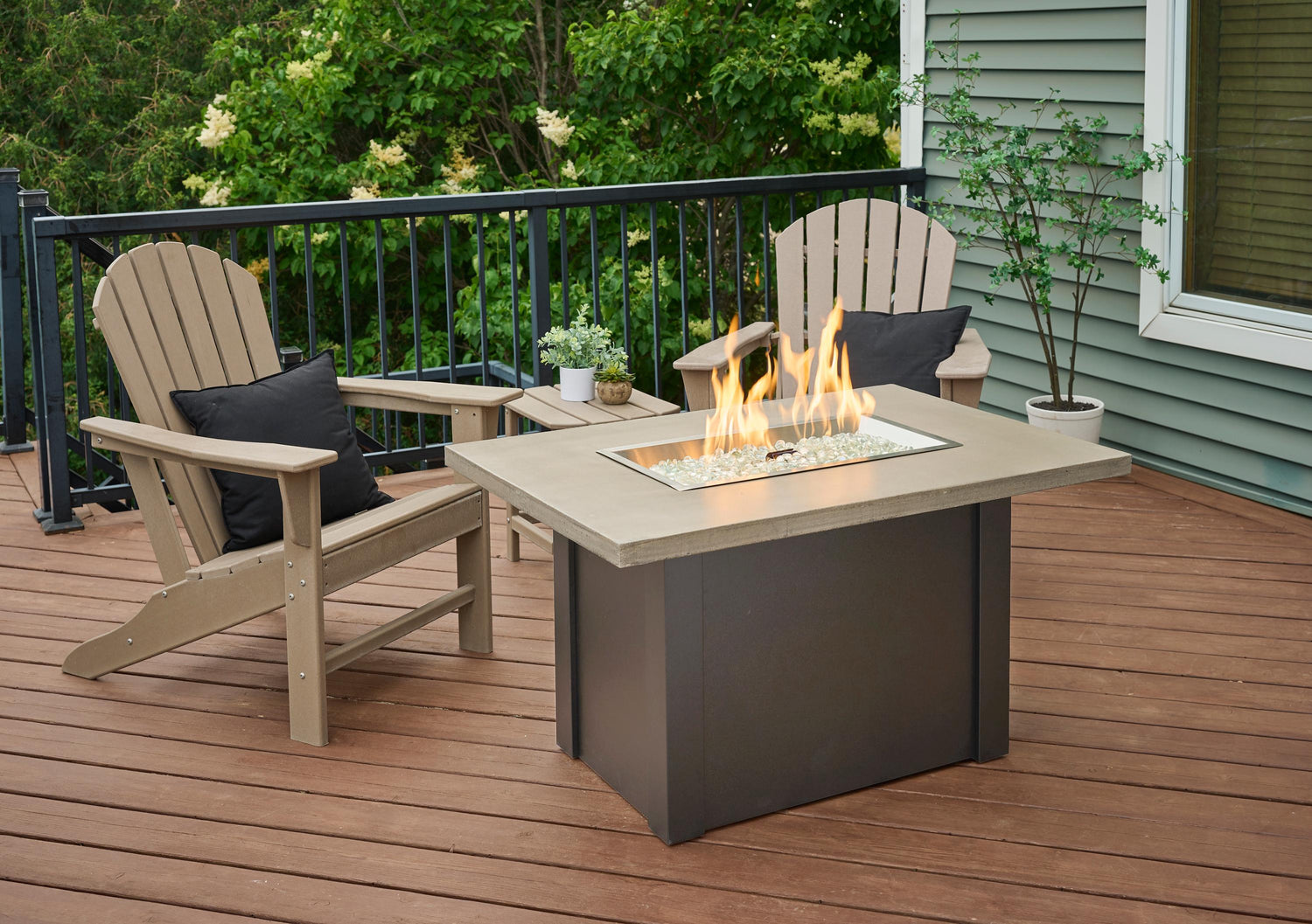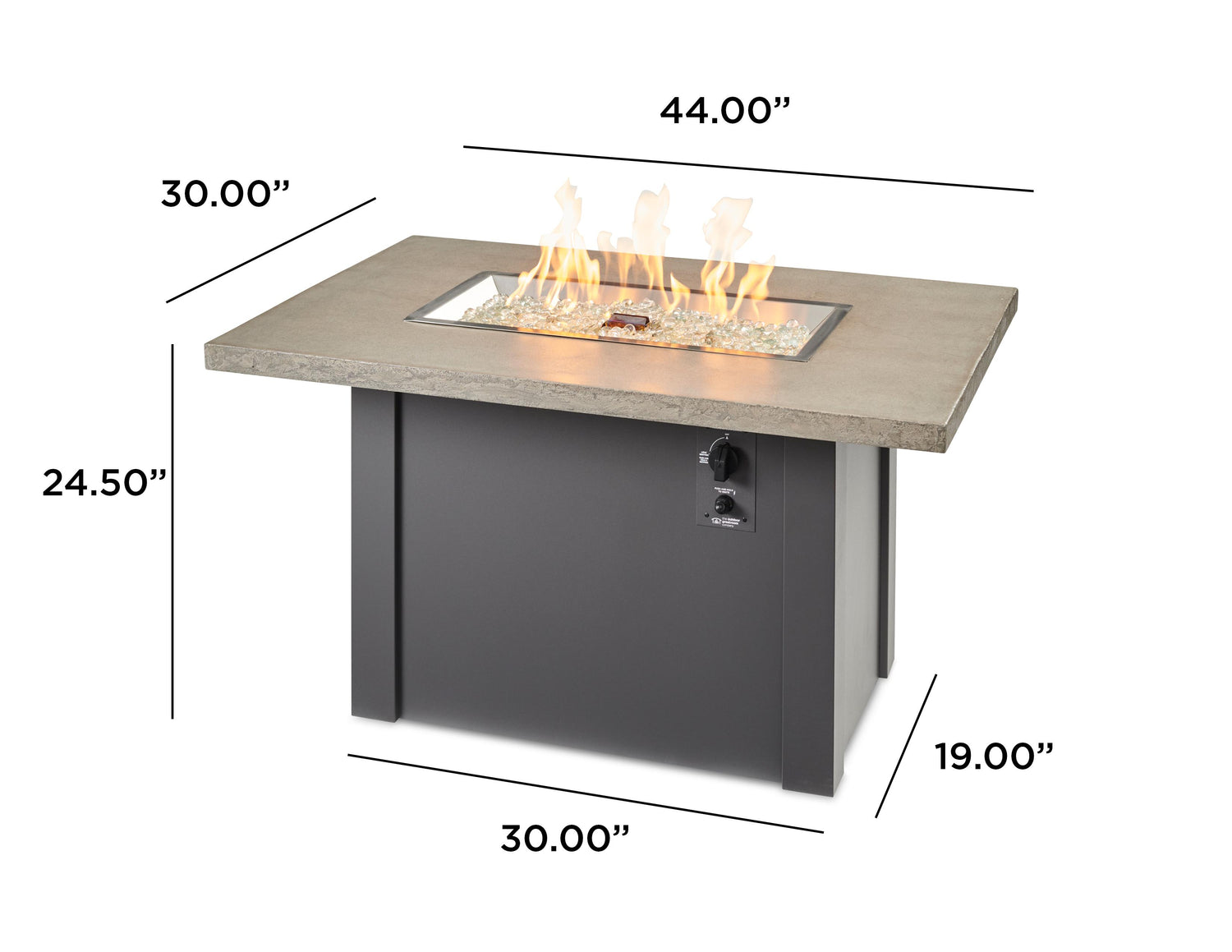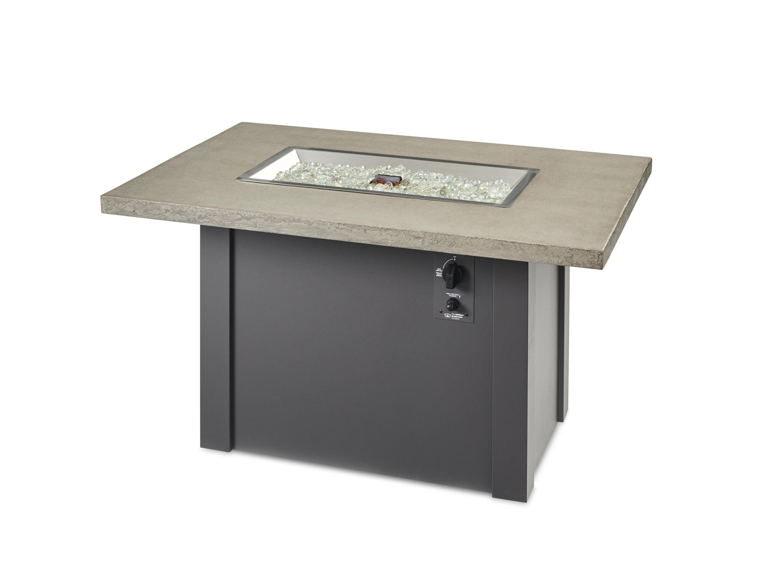 The Driftwood Havenwood Gas Fire Pit Table offers a contemporary style that's perfect for entertaining. The unique Driftwood Everblend textured top pairs with a grey powder-coated metal base. The 12" x 24" Crystal Fire ® Plus burner offers a warm, inviting glow. Every handcrafted Everblend top is one-of-a-kind – variations in color, texture, and pattern will occur.