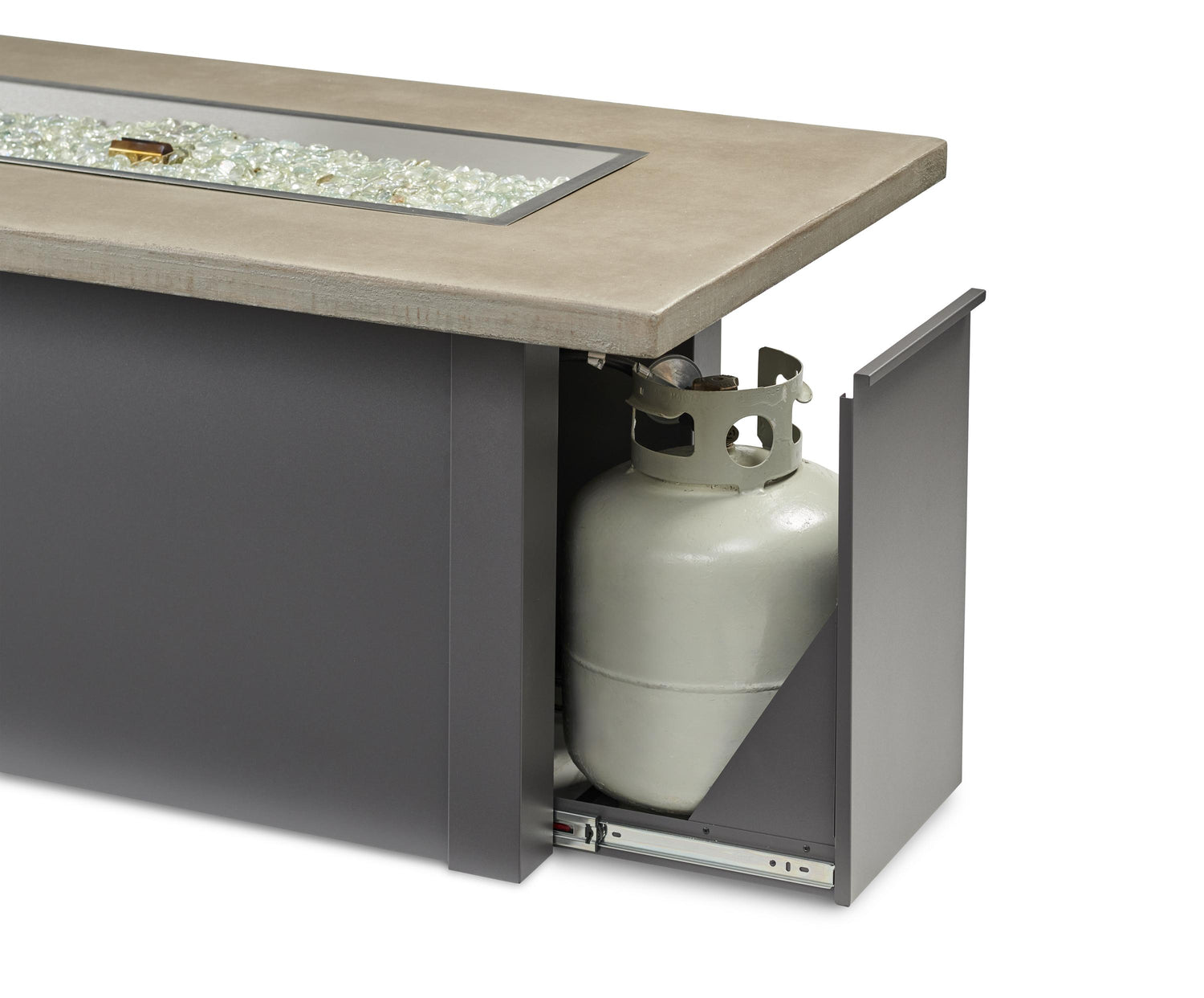- Concealed Storage: The sliding access door conceals a standard 20 lb. propane tank within the base, maintaining a tidy and organized appearance while ensuring easy access for fuel changes.