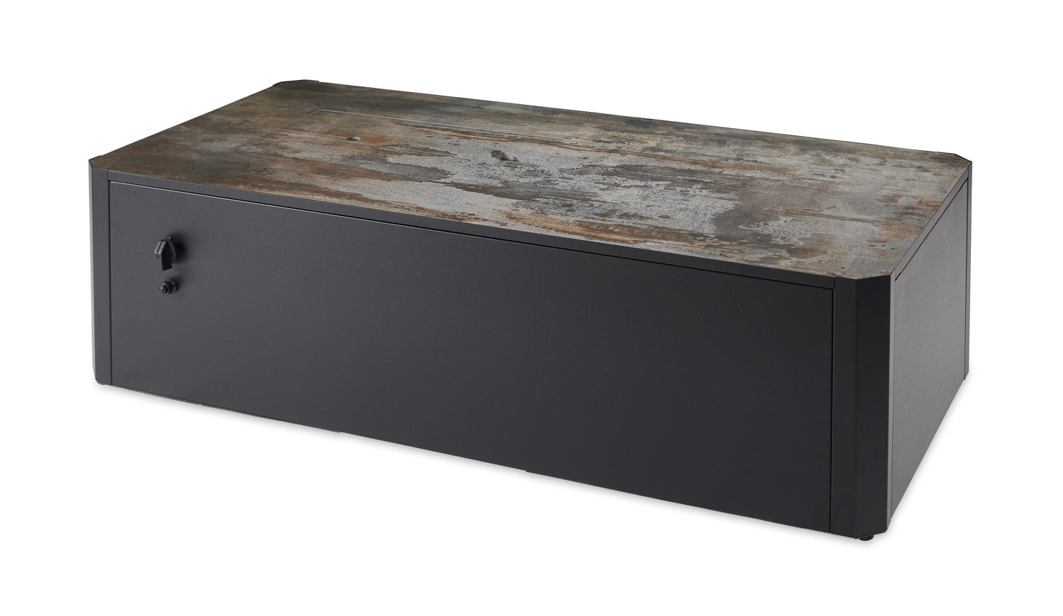 The Kinney Fire Pit Table features an ultra-modern design that is perfect for entertaining. The low-profile base meets a contemporary top to ensure your focal point is the main attraction on your patio. Extra tabletop space makes it convenient for entertaining guests. Gather everyone around the 12" x 24" Crystal Fire Plus burner for a cozy, relaxing time.