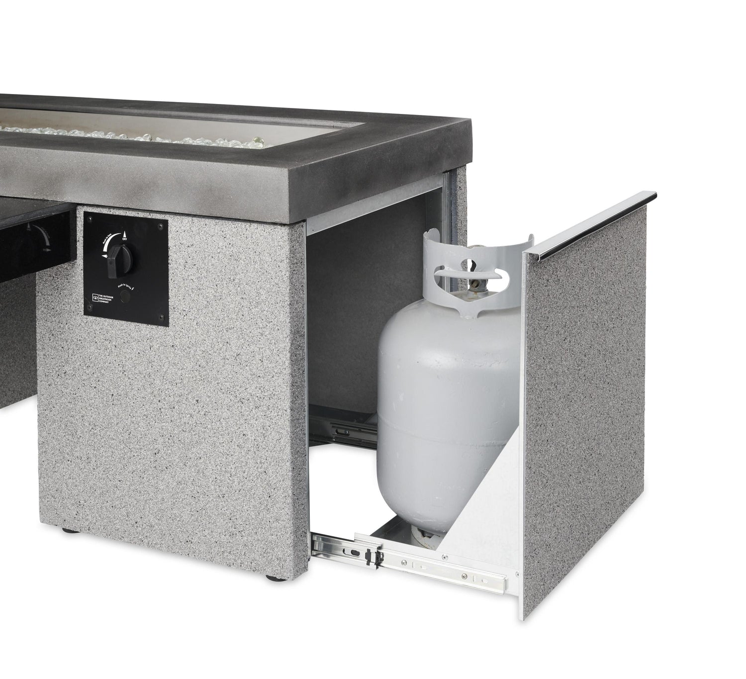 Sliding Access Door conceals standard 20 lb. propane tank in base