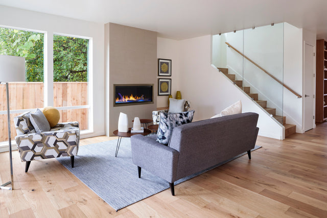 The Artisan brings the ambiance of a modern fireplace to your space easily and affordably. Now updated, these vent-free gas fireplaces will forever change how you look at hearths. Clean, contemporary lines, elegant lighting, and gorgeous flames elevate your fireside experience. Available in several sizes and a see-through model, this linear fireplace can be added nearly anywhere, warming your home with 99.9-percent efficiency. The final touches are the black reflective glass panels and multi-colored LED hearth lighting that transform this contemporary fireplace into an eye-catching show.