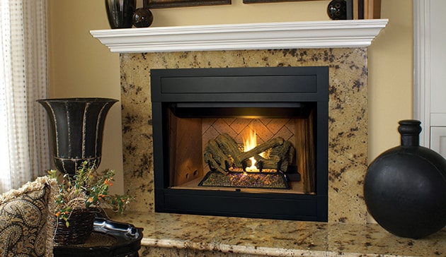 The BRT40 B-Vent Fireplaces feature multidimensional refractory log arrangement and deep glowing ember bed. An aluminized "U" tube dual burner provides real wood-fire ambiance with 40,000 BTU. All BRT40s ship smooth faced and include hidden screen pockets, easy access flue damper with safety shut-off switch, and warm red refractory. Includes red brick hearth.