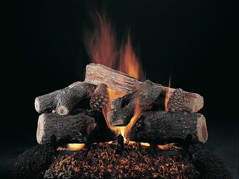 Bark and char front logs with mixed bark and split top logs and pine cones. Two piece front log. Lower profile good for standard factory-built and larger fireplaces.