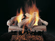 Reversible Bark/Split Logs with char features and pine cones. Two piece front log. Lower profile good for standard factory-built and larger fireplaces.